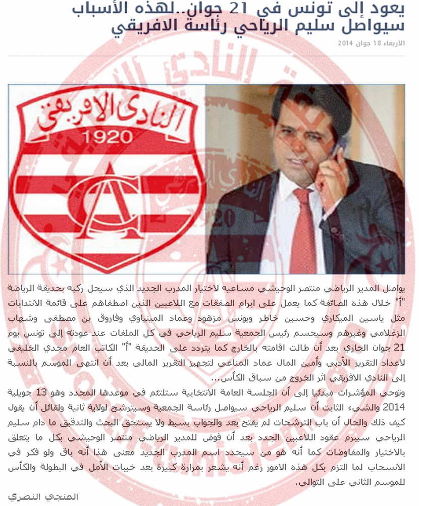 تعديل المشاركة سليم الرياحي يعود الى تونس 21 جوان لهذه الاسباب سيواصل رئاسة الافريقي Tunisie Magazine 18 juin 2014 (0) فيسبوك تويتر بنترست واتساب ريدايت لينكدين Commentaires