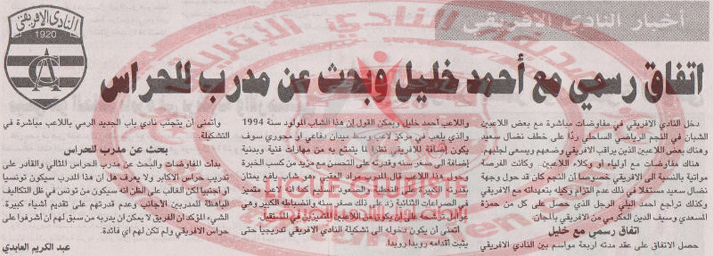 تعديل المشاركة اتفاق رسمي مع احمد خليل ... والبحث عن مدرب للحراس Tunisie Magazine 21 juin 2014 (0) فيسبوك تويتر بنترست واتساب ريدايت لينكدين Commentaires